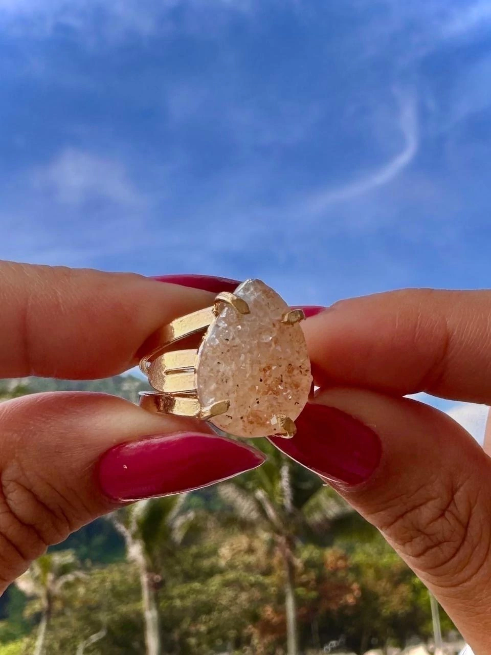 O Anel Gota Drusa de Ágata é uma joia que une beleza e energia! Produzido em metal hipoalergênico com banho de ouro 18k, oferece conforto e sofisticação para peles sensíveis. Seu aro regulável garante ajuste perfeito, enquanto a drusa de ágata traz benefícios energéticos, promovendo equilíbrio e proteção. Um toque único para realçar seu estilo com charme e bem-estar!