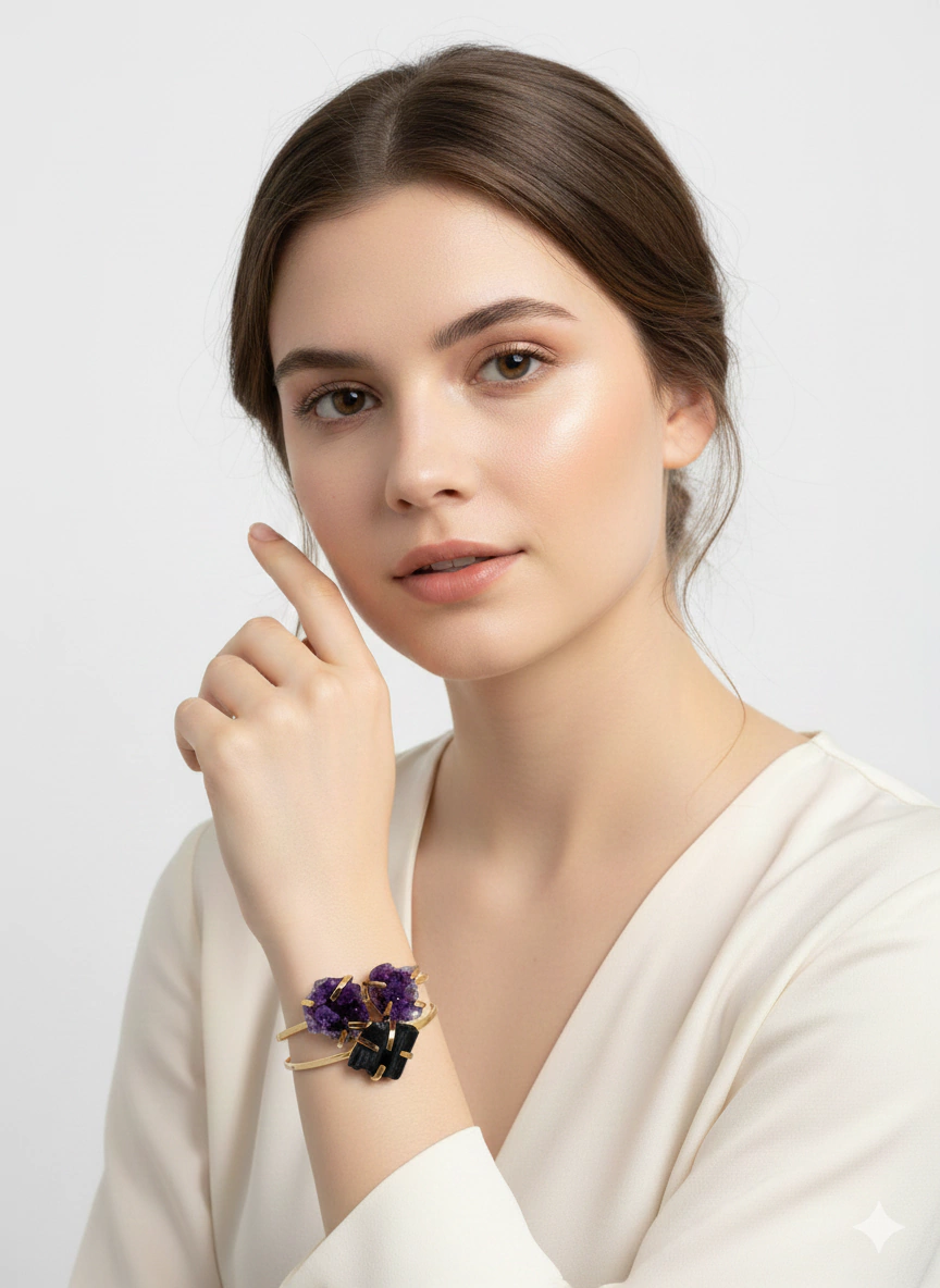 Um amuleto de força e proteção. A união da Ametista — que acalma, eleva e transforma — com a Turmalina Negra que garante um toque de força e proteção. A união da Ametista — que acalma, eleva e transforma — com a Turmalina Negra, poderosa guardiã energética, cria uma joia que purifica e fortalece seu campo emocional.