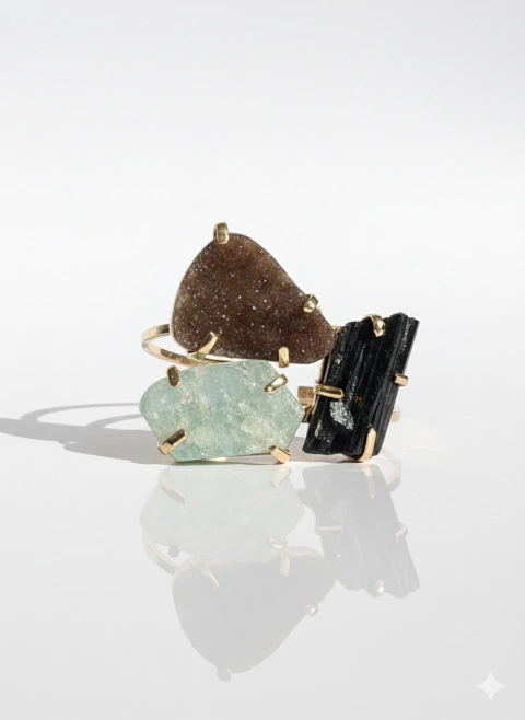 Com pedras brutas naturais como drusa de ametista, água marinha e turmalina negra, essa peça traz proteção, equilíbrio e elegância para o seu visual.