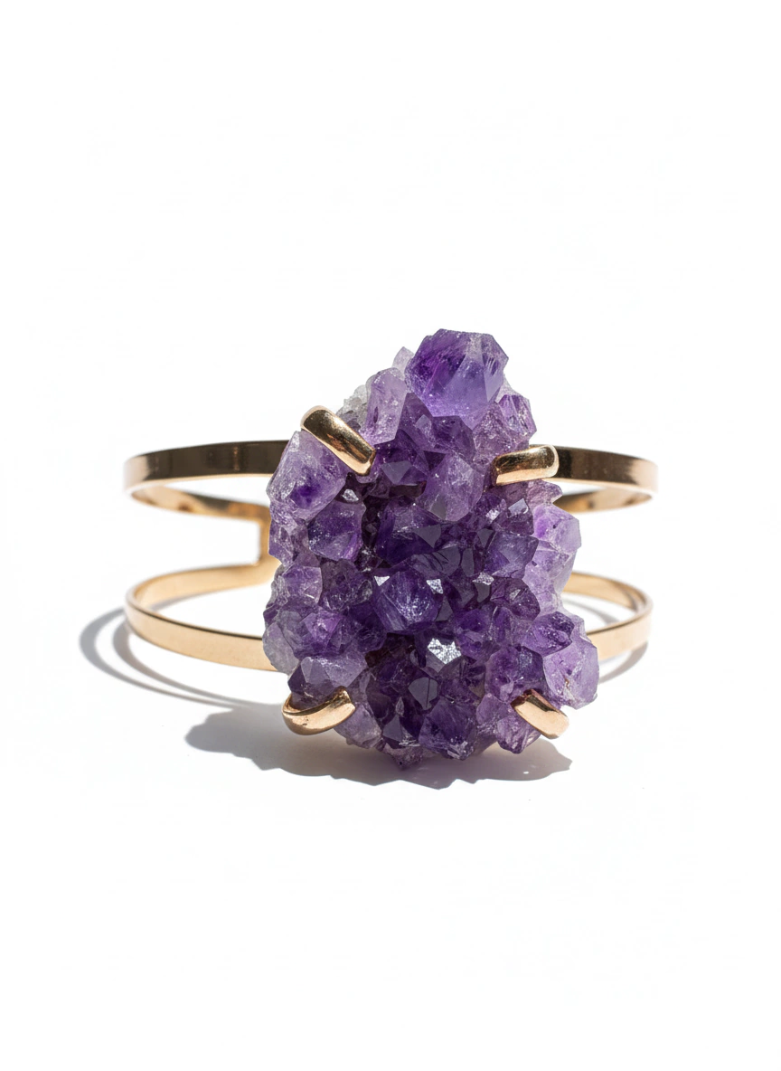 Bracelete feito em metal, com banho de ouro 18k e drusas de ametista naturais.