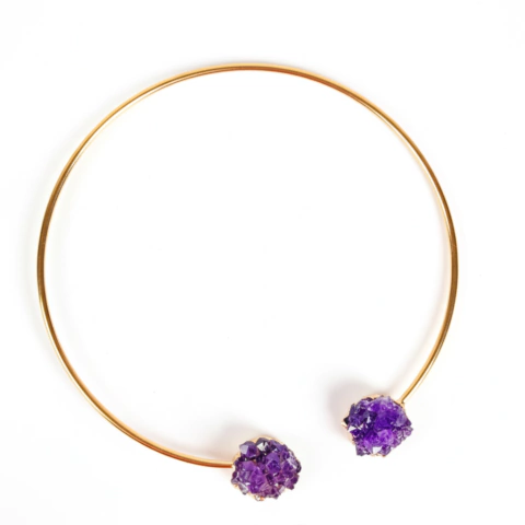 Choker feito em metal, com banho de ouro 18k e drusas de ametistas naturais.